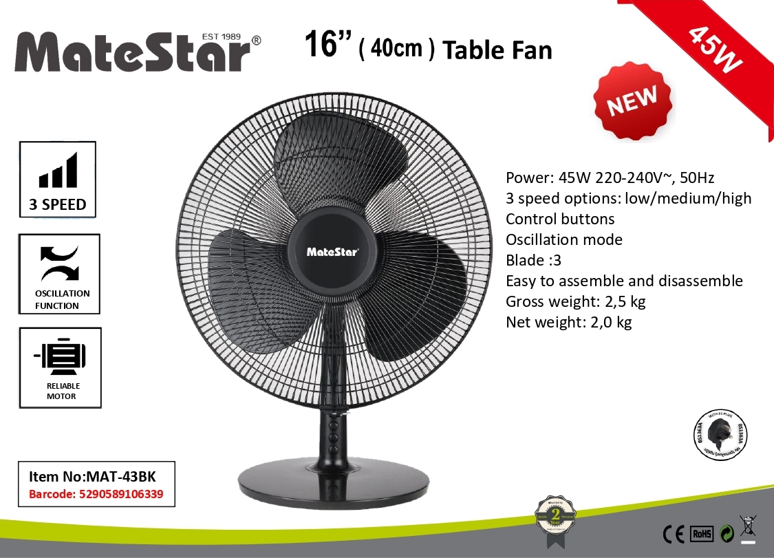 MATESTAR Table Fan 16″ MAT-43BK